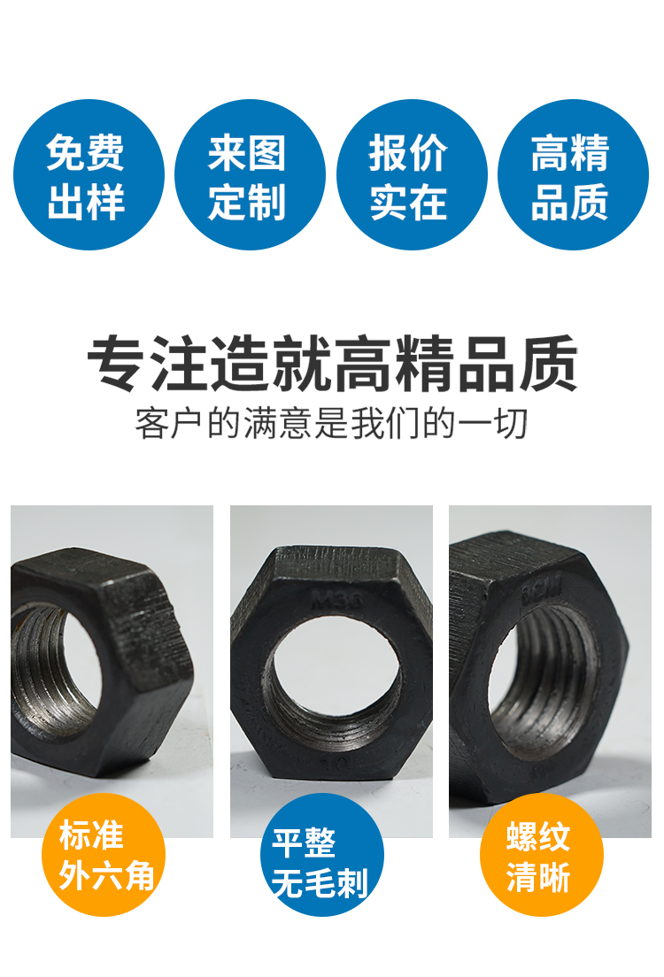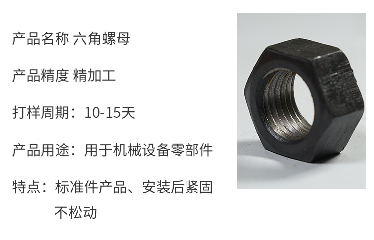 产品详情:螺母是紧密连通机器装置的零部件。它们可以通过相同标准的内螺纹,螺母和螺钉连结在一起。例如,M4-0.7的螺母只能与M4-0.7的螺钉一同采用(在螺母中,M4表示螺母的内径约为4mm,0.7表示两个螺纹牙之间的相距是0.7mm);美国产品也是如此,例如,1/4-20螺母只能与1/4-20螺钉配合用到(1/4表示螺母的内径约为0.25英寸,而20表示每英寸有20个齿)。