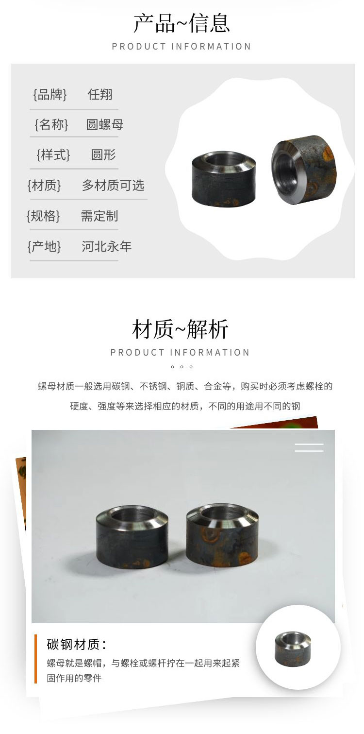 产品详情:异形小圆形螺母,M20异形非标准圆形螺母,圆形螺母大都为细螺纹,通常用以较大直径的连接。这种螺母很容易用钩扳手安装和拆卸,通常配有圆螺母止动垫圈,通常与滚动滚珠轴承配合用到,由于外径和厚度小,这种小螺母具构造连贯,适于两件套用到,并可用以轴向微调。
